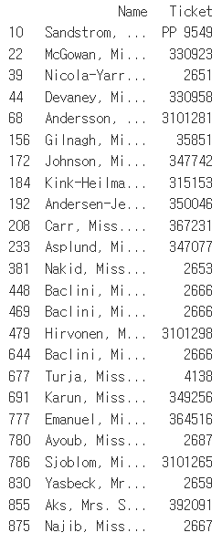 다음은 10세 미만인 승객의 나이와 이름 칼럼만 추출한다.