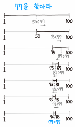 5. 이런 식으로 점점 범위를 좁혀 나가면 7번 이내에 무조건 숫자 77을 맞출 수 있게 된다.